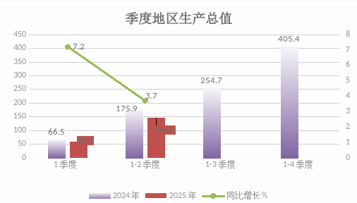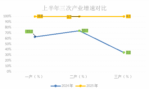 经济运行稳中有进,二三次产业协同发展。初步核算,上半年全区地区生产总值144.9亿元,按不变价格计算,同比增长3.7%,经济运行总体相对平稳。其中,第一产业增加值0.9亿元,同比下降8.8%,对经济增长的贡献率为-2.3%;第二产业增加值101.3亿元,同比增长3.7%,对经济增长的贡献率为65.9%;第三产业增加值42.8亿元,同比增长4.1%,对经济增长的贡献率为36.32%。三次产业增加值占GDP的比重分别为0.6%、69.9%和29.5%,分别拉动GDP增长了-0.08、2.44、1.34个百分点。
