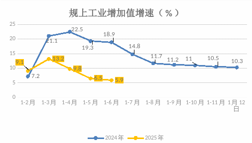 上半年,规模以上工业增加值同比增长5.9%,比一季度回落7.3个百分点 ,比去年同期回落13个百分点。