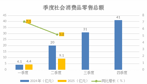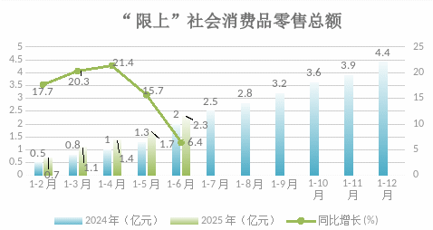 限额以上社会消费品零售总额完成2.28亿元,同比增长6.4%,“限上”占比为25%。