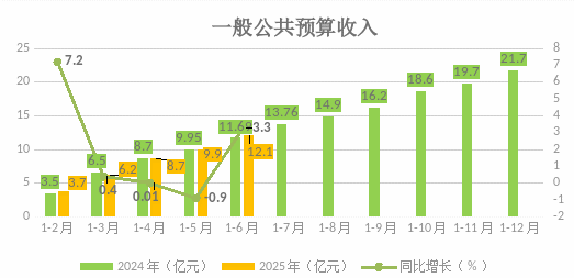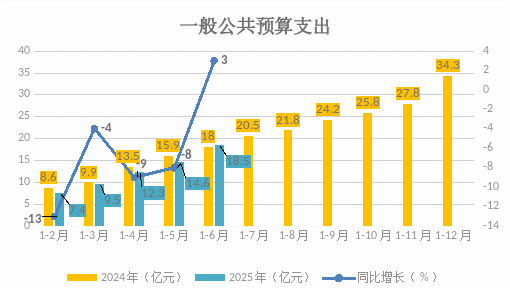财政支出由负转正。上半年,一般公共预算支出完成18.48亿元,同比增长3%。其中,一般公共服务支出2.04亿元,同比下降14%;公共安全支出0.2亿元,同比增长73%;教育支出1.79亿元,同比增长41%;科学技术支出0.0023亿元,同比下降12%;文化旅游体育与传媒支出0.1亿元,同比增长22%;社会保障和就业支出4.09亿元,同比增长1%;卫生健康支出0.6亿元,同比下降18%;节能环保支出0.24亿元,同比增长40%;城乡社区事务支出4.56亿元,同比下降19%;农林水事务支出2.11亿元,同比增长3%;交通运输支出0.25亿元,同比下降45% 。公共安全、教育、社保、环保、农林水事务等民生领域有效保障。
